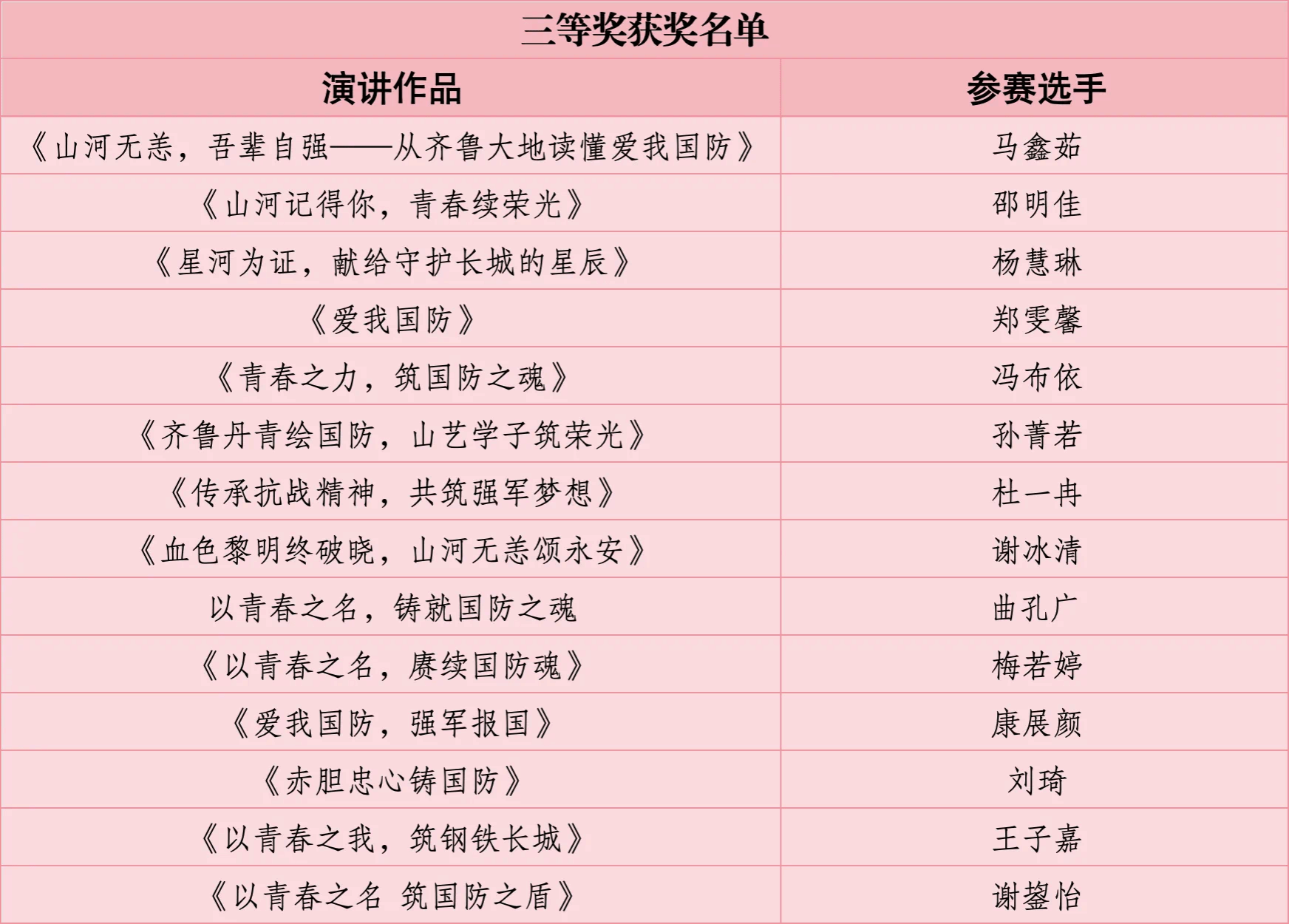 本次“爱我国防”主题演讲比赛的成功举办,是我院贯彻落实立德树人根本任务、深化新时代全民国防教育的重要载体和生动实践。比赛有效激发了广大青年学子的爱国热情、忧患意识和国防担当,为培养担当民族复兴大任、矢志强国强军事业的时代新人注入了强劲的精神动力。